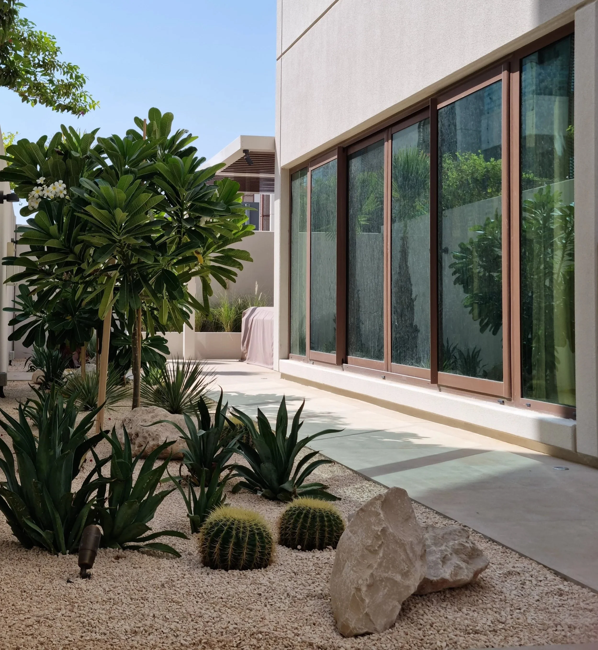 Contemporary gravel garden in Dubai with barrel cacti, agave, yucca, a Frangipani tree, and decorative boulders.